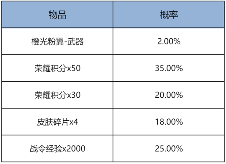 購買禮包必得酷炫機(jī)甲(1日),可額外隨機(jī)獲得以下之一:榮耀積分x50、榮耀積分x30、皮膚碎片x4、戰(zhàn)令經(jīng)驗(yàn)x2000、橙光粉翼-武器。累計(jì)50次必得橙光粉翼-武器。