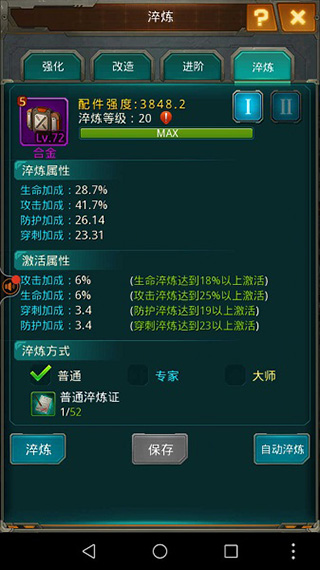 第一,你要先把配件用普通資源硅淬煉滿15-17級(jí)最好,把那些屬性淬煉大概到0.6左右,也就是比如17級(jí)淬煉穿刺滿是15,那你就必須要把穿刺搞到9左右,大概上下波動(dòng)8-10也是可以的,也不是說一定要多準(zhǔn)確,之后就用硅把配件淬煉到滿級(jí)到20級(jí),如果有好的屬性,別急著保存,先看下,因?yàn)槟闶窍胍せ罱K極4個(gè)隱藏屬性的,所以,你要忍住,到了20級(jí)滿級(jí),就可以用代金券去淬煉,不過在20級(jí)淬煉之前,能否獲得好屬性是看個(gè)人人品的,如果你淬煉后觸發(fā)了特別好的屬性,才建議你保存,要不就別保存了,保持淬煉到20級(jí)。