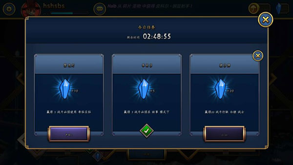 1、任務(wù):在游戲的大廳頁面點(diǎn)擊任務(wù)可以查看每日任務(wù),這里每天會為大家派出三個(gè)任務(wù),完成任務(wù)后可以領(lǐng)取到相應(yīng)的寶石獎勵。