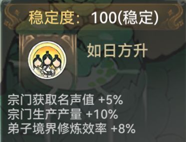 玩家宗門穩(wěn)定度達到96以上時,可以獲得如日方升狀態(tài)。