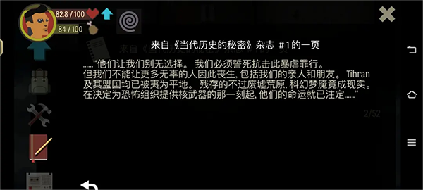 天空之山是一款很受歡迎的角色扮演生存類(lèi)的手機(jī)游戲。是從端游上移植而來(lái)的,即便是在手機(jī)上也可以體驗(yàn)到游戲帶給你的魅力的。在游戲內(nèi)玩家將會(huì)扮演一位末日世界的幸存者的,需要你在這個(gè)充滿(mǎn)著變異喪尸的世界中生存的。游戲的背景是設(shè)定在了第三次大戰(zhàn),男主角僥幸活下來(lái)了,需要玩家不斷收集物資,然會(huì)活下來(lái)的。游戲還是有著超高的隨機(jī)性的,是可以為游戲增加更多的樂(lè)趣的。想?yún)⑴c就趕緊點(diǎn)擊它下載吧。