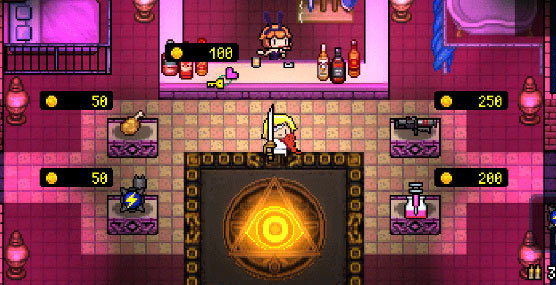 每一層的地圖中都有一名boss,打敗該boss后便能夠進(jìn)入下一層繼續(xù)冒險(xiǎn)。在戰(zhàn)斗過(guò)程中擊殺怪物或者開(kāi)啟寶箱都有幾率獲得金幣,這些獲得的金幣可以在商店處購(gòu)買道具和武器,商店的位置是在地圖中隨機(jī)生成的。并且在擊殺敵人時(shí),不僅僅有幾率掉落金幣,還會(huì)有一定幾率掉落“藍(lán)魂”,“藍(lán)魂”作為道具可在地圖中的NPC處解鎖道具槽以及人物動(dòng)作等一系列的額外附加功能。因?yàn)閞oguelike元素的存在,在流程中玩家在戰(zhàn)斗時(shí)被怪物擊殺,便會(huì)回到最開(kāi)始的初始房間“狄加瑪?shù)姆块g”里并且同時(shí)失去身上所有武器裝備,至于獲得的道具以及已解鎖的能力在死后可以保留。