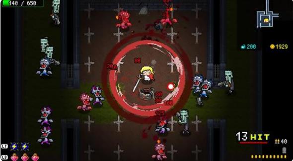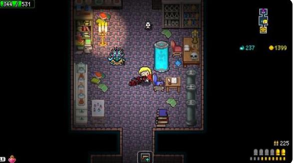 游戲整體節(jié)奏還算是比較快地,玩起來(lái)感覺(jué)有些爽快。玩法跟傳統(tǒng)地牢類游戲,特別是同類型的帶有roguelike元素的2D 射擊游戲 差不多。所有關(guān)卡中的地圖全都是隨機(jī)生成,人物能夠攜帶近戰(zhàn)武器和遠(yuǎn)程武器兩種,在流程中玩家可以通過(guò)收集怪物掉落的以及開(kāi)寶箱獲得的寶物提高角色的屬性。