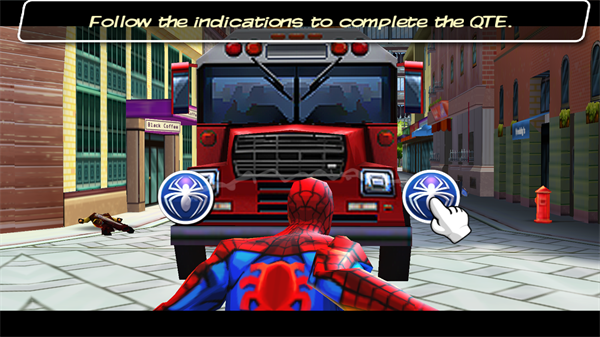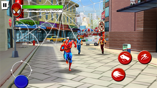 戰(zhàn)斗節(jié)奏緊湊,玩家可通過(guò)組合虛擬搖桿與按鍵實(shí)現(xiàn)快節(jié)奏連招。連擊系統(tǒng)鼓勵(lì)持續(xù)攻擊,積累積分可兌換蜘蛛戰(zhàn)衣或技能升級(jí),同時(shí)支持QTE(快速反應(yīng)事件)觸發(fā)華麗招式,提升操作爽快感。