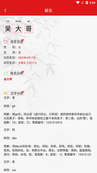 3、點擊解名可以查看這個名字的意思和系統(tǒng)八卦算法等