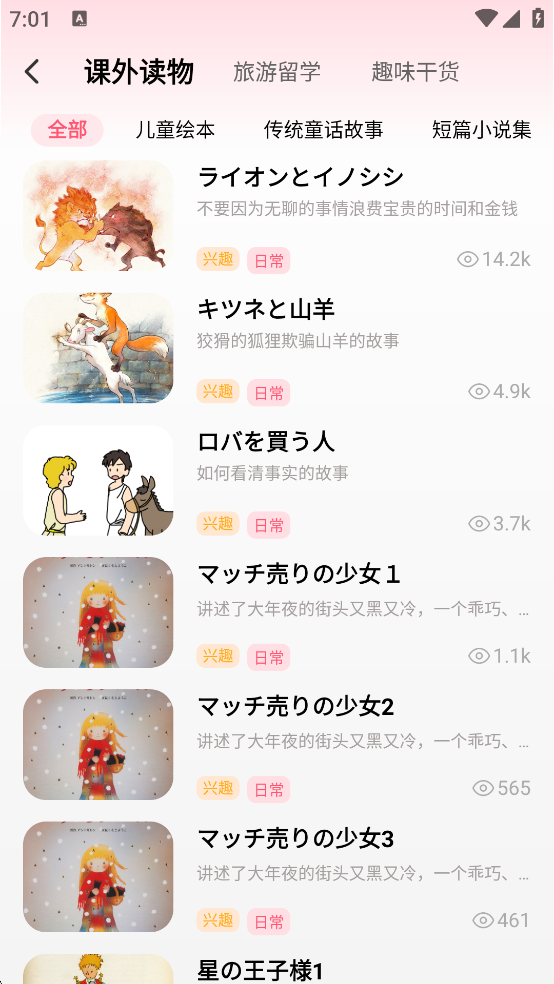 文章讀物:分為課外讀物、考試留學(xué)、趣味干貨三個大類,配合日語和譯文,滿足日語初學(xué)者閱讀需求
