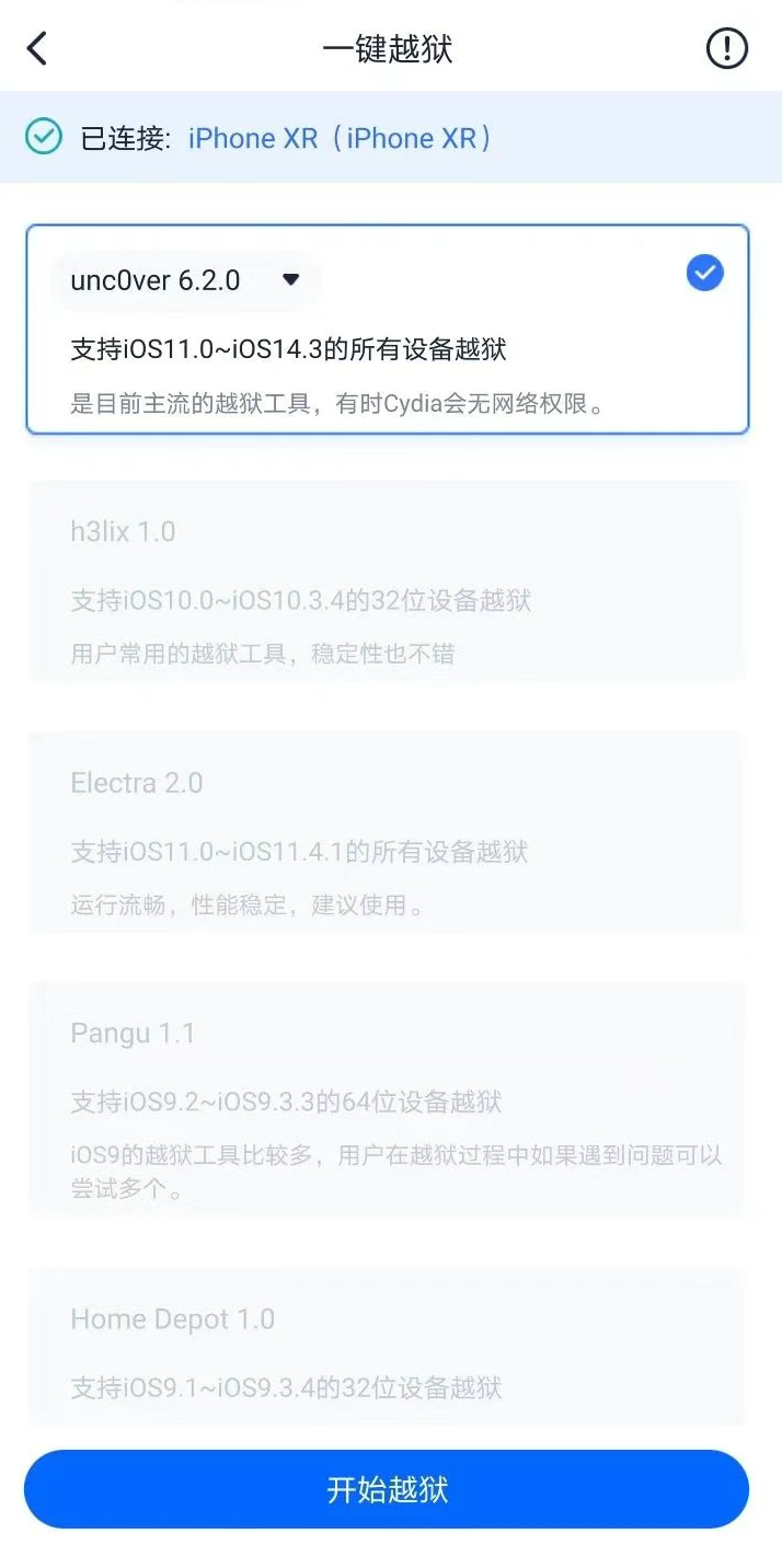 若有當前 iPhone 支持的越獄工具,會在應(yīng)用界面中自動顯示,勾選后點擊“開始越獄”并耐心等待越獄工具安裝,安裝完畢即可在 iPhone 上打開越獄工具運行。