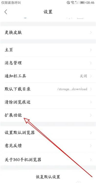 3、這時(shí)就會(huì)打開(kāi)360瀏覽器的設(shè)置界面,點(diǎn)擊界面中的擴(kuò)展功能菜單項(xiàng)