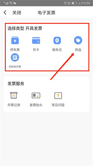 3、進(jìn)入到電子發(fā)票界面,包括“停車費(fèi)”、“月卡”“ 租車 位”“商品”和“憑賬單開票”類型,這里以“商品”為例,